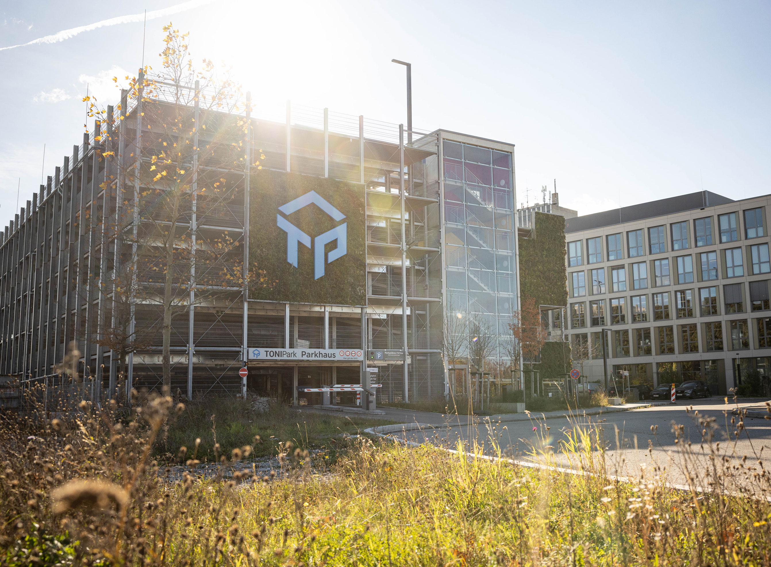 Kostenlose Parkplätze vor dem Haus und in dem (vertikal begrünten) Parkhaus, gekennzeichnet mit – Internisten im ToniPark, sowie im gesamten Areal kostenlos – hier mit Zeitlimit von 3 Std. – elektronische Erfassung
